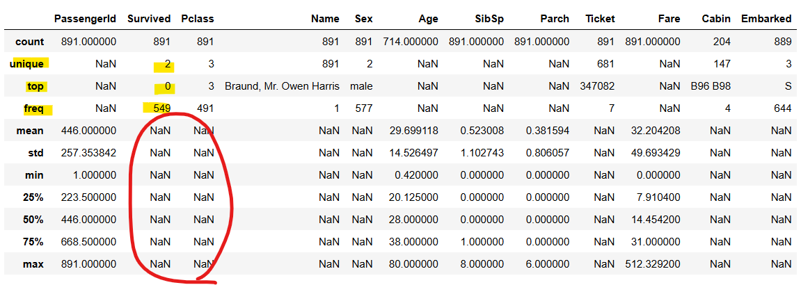 때문에 위에서 범주형 변수로 바꾼 Survived는 통계량은 Nan이지만 위의 값은 나타나게된다.