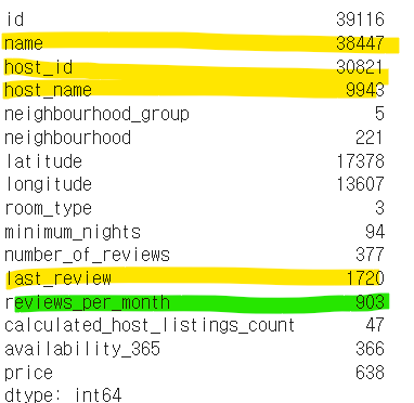 # name, host_name, last_review, host_id >> 고유의 값으로 각각 너무 많으므로 지워버림